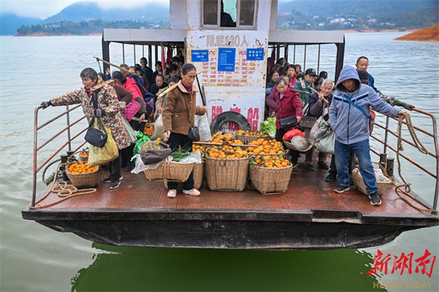 The photo, taken on November 25, shows villagers carrying citrus fruit with bamboo baskets and taking a boat to the local market at Dongjiang Lake Pier in Huangcao Town, Zixing City. This day marked the town's "Ganxu Day," where locals transported golden citrus fruit by boat for trade. The event drew numerous residents, tourists, and buyers, forming a distinctive "boat transport + market" production and marketing model. In recent years, the local authority has leveraged Dongjiang Lake's quality ecological resources to vigorously develop its citrus industry. As the core producing area, Huangcao Town has turned citrus fruit into a "golden industry" that drives income growth for local farmers. (Photo/Guo Liliang, Hunan Daily)
