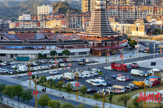 The photo shows a free parking lot operating in an orderly fashion at Sasui Square in Tongdao Dong Autonomous County. In recent years, the county authority has implemented people-centered initiatives such as building free parking facilities and bus services access to all villages, so as to effectively address public transportation difficulties and enhance residents' sense of gain. (Photo/Li Shangyin)