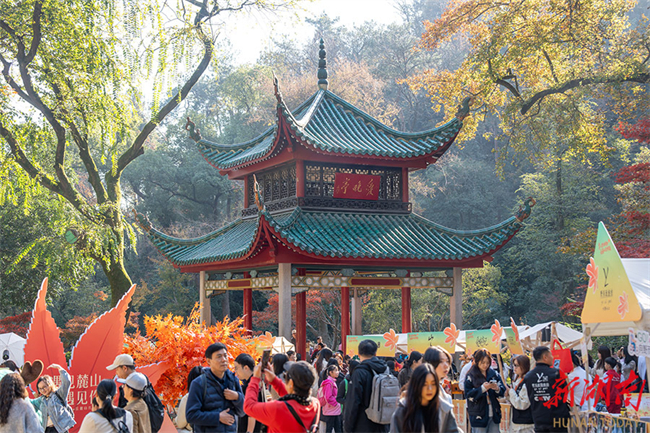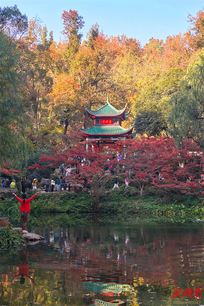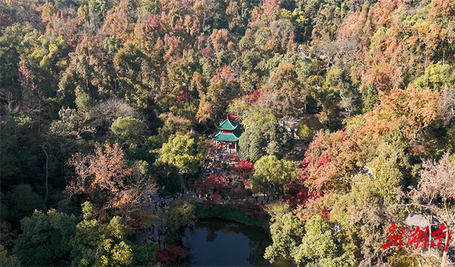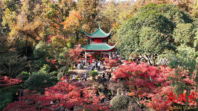 The photo, taken on November 30, shows the scenery of red maple leaves near the Aiwan Pavilion at the Yuelu Mountain Scenic Area, Changsha City. Maple leaves here have turned red, entering their best viewing period. Aiwan Pavilion, one of China's Four Famous Pavilions, is now surrounded by fiery red maples, creating a breathtaking scene that attracts numerous tourists. (Photo/Gu Pengbo, Hunan Daily)