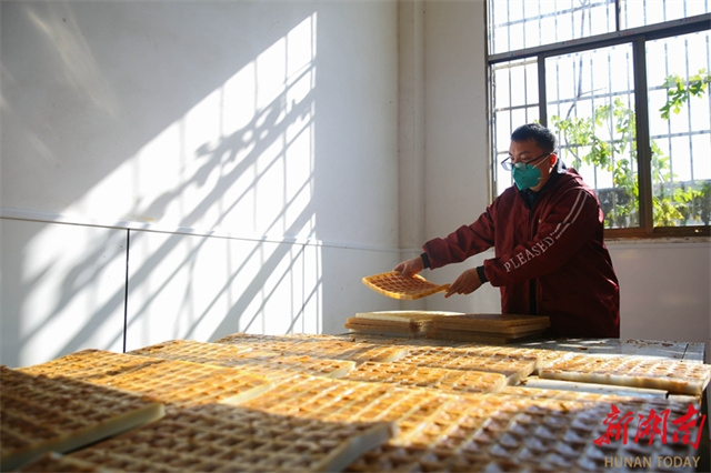 The photo, taken on November 29, shows workers removing molded brown sugar from trays in preparation for packaging at Laowu Village, Shanjie Hui Ethnic Township, Longhui County. (Photo/Zeng Yong and Sun Zhongkun)