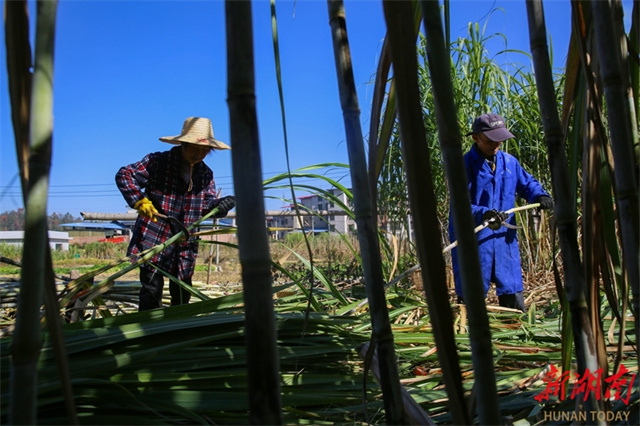 The photo, taken on November 29, shows villagers harvesting sugarcane in the fields at Laowu Village, Shanjie Hui Ethnic Township, Longhui County. (Photo/Zeng Yong and Sun Zhongkun)