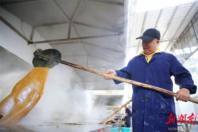 The photo, taken on November 29, shows workers preparing brown sugar using traditional techniques at Laowu Village, Shanjie Hui Ethnic Township, Longhui County. (Photo/Zeng Yong and Sun Zhongkun)