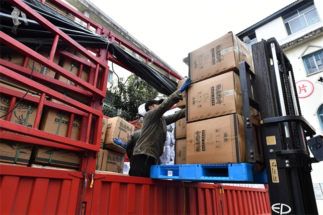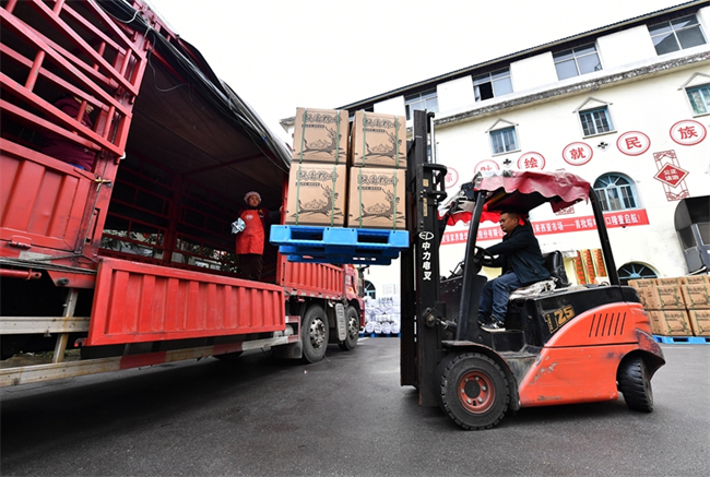 The photo, taken on December 4, shows workers loading up a truck with reed leaves at a company in Zhangjiajie. On that day, the company delivered 50 tonnes of high-quality reed leaves to Malaysia. This was the company's first shipment since it secured a 200-tonne order at the 2025 Malaysian International Food & Beverage Trade Fair this July. (Photo/Shao Ying and Li Han)