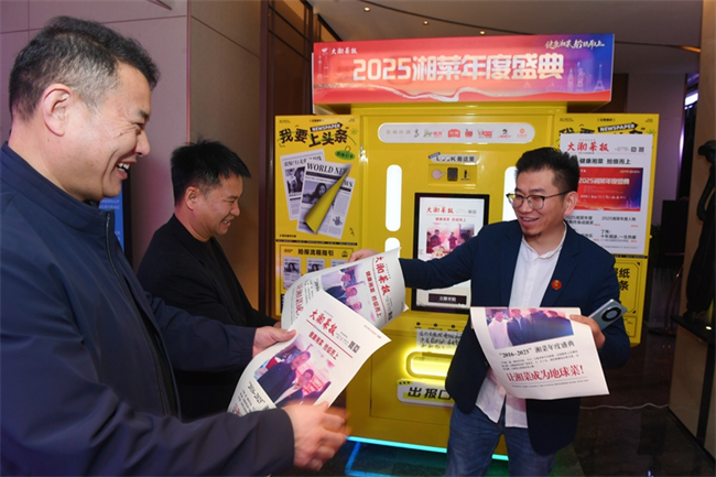 The 2025 Hunan Cuisine Grand Event, themed on healthy diet, opened in Changsha on December 8. The event continued its missions of "giving an insight of industry trends, commending industry benchmarks, and celebrating the glory moments." Diverse activities are scheduled, including industrial symposiums, brand promotions, award ceremonies, and culinary competition, sharing joy and honor with the Hunan cuisine practitioners around the world. The photo shows people experiencing an "I am on the front page" interactive printing machine initiated by the Hunan Cuisine Newspaper. (Photo/Xu Xing and Dai Houcun, Hunan Daily)
