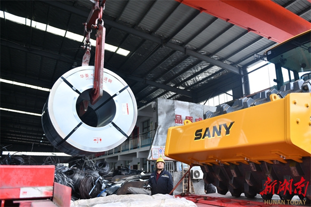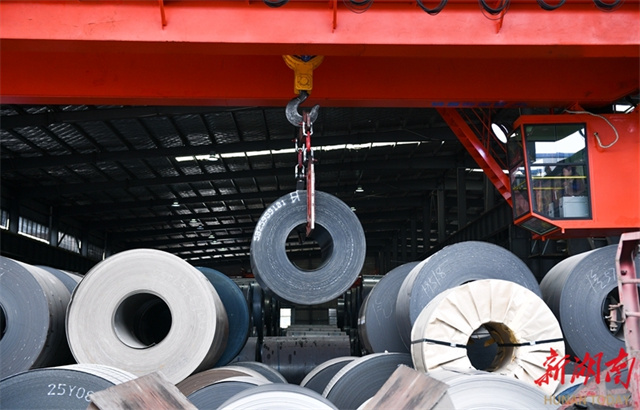 The photo taken on December 8 shows a crane lifting heavy steel coils at the production workshop of a technology company in Loudi Economic and Technological Development Zone. In recent years, spearheaded by the goal of building a "Materials Valley" in central China, the city has promoted the development of industrial chains and clusters, establishing a complete industrial ecosystem spanning from new steel materials, scrap steel recycling and deep processing to the manufacturing of components and high-end equipment. (Photo/Wu Yonghua)