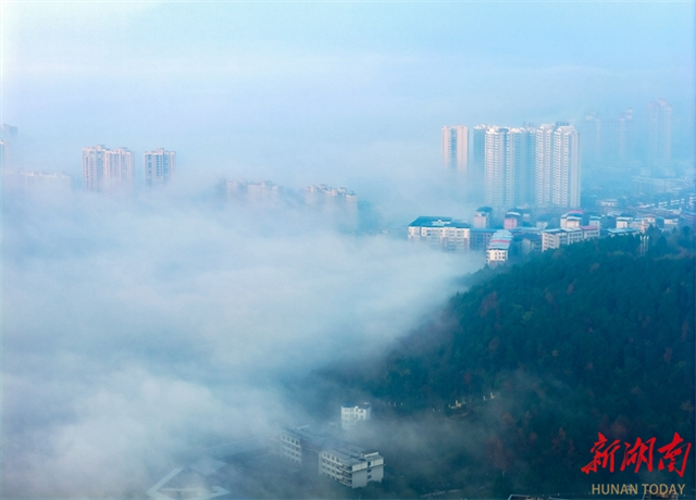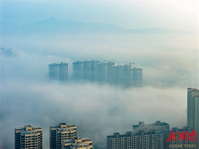 On the early morning of December 8, an advection fog phenomenon appeared in the Dong'an County. The buildings and mountain ranges loomed in and out of view amid mist and clouds, creating an amazing scene where human dwellings and nature harmoniously coexist. Many areas across Hunan Province witnessed dreamlike morning misty landscapes on the same day. (Photo/Cai Xiaoping)