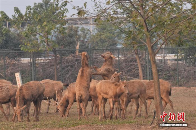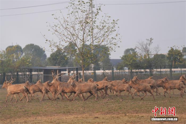 Rescued Milu deer run in the park. (Photo/Yang Huafeng, Xinhua)