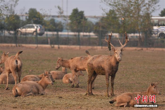 Rescued Milu deer rest in the park. (Photo/Yang Huafeng, Xinhua)
