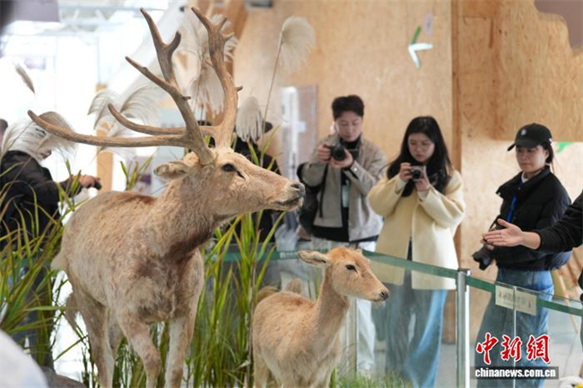 The delegation members observe Milu deer specimens. (Photo/Yang Huafeng, Xinhua)