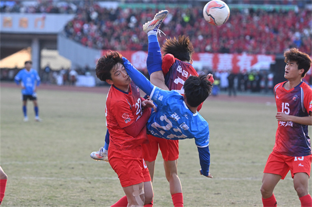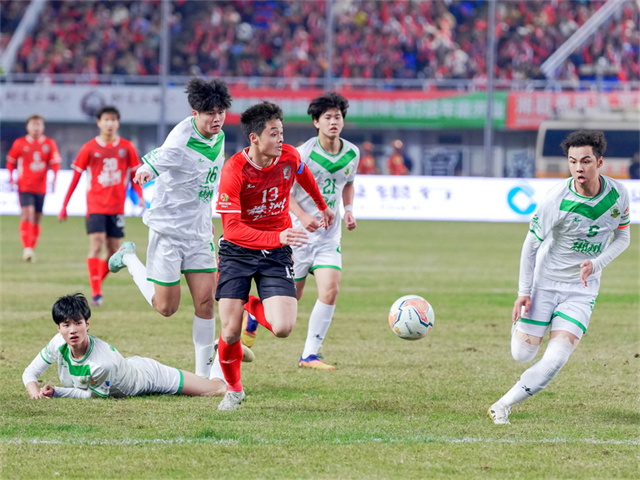 On the evening of December 14, football players engaged in a fierce competition at Changsha Helong Sports Center. On the same day, the first knockout round of the 2025 Hunan Football League kicked off. Changsha team (in red), the home team, defeated Yueyang team 2-0 to advance into the semifinals alongside Changde, Yongzhou, and Zhuzhou teams. (Photo/Guo Liliang, Hunan Daily)