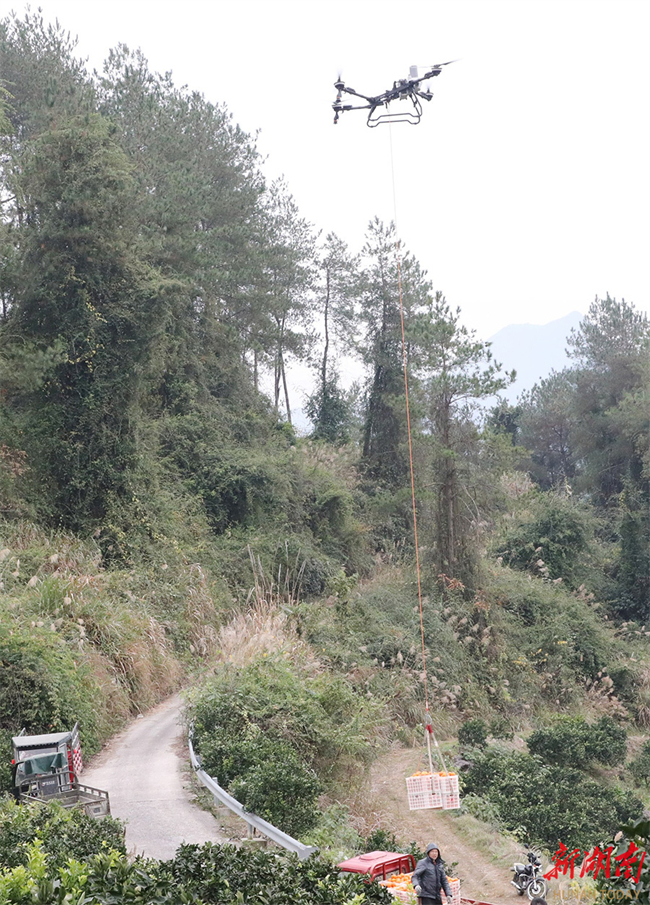 Fruit farmers use a drone to transport navel oranges at Nuoli Village, Qingshuiping Town, Baojing County on December 15. Navel oranges are in season currently. The county authority has organized a drone transport team to move the fresh oranges out of the mountains in an efficient way. This initiative aims to reduce labor cost, enhance transport efficiency, and support the navel orange industry development. (Photo/Yu Caihua and Tang Chaoying)
