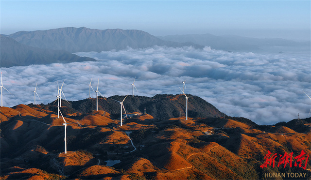 At dawn on December 17, wind turbines, a sea of clouds, and blue skies together formed a harmonious winter sunrise scene featuring natural beauty and modernity atop Wanyang Mountain in Guidong County. (Photo/Deng Renxiang)