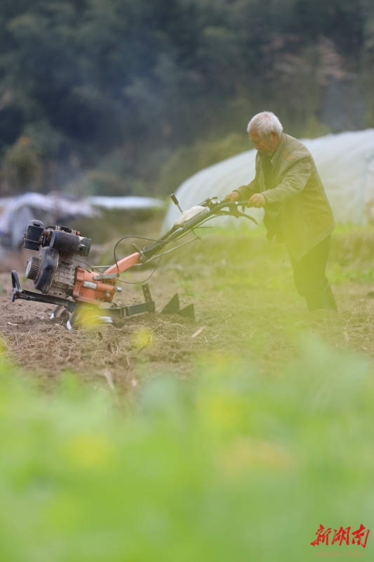 The photo, taken on December 21, shows a farmer ploughing fields at Ximenkou Village, Qianzhou Neighborhood, Jishou City. As Dongzhi solar term begins, local farmers are seizing the time to conduct seasonal farmwork such as harvesting, sowing, and crop management, creating a busy farming scene. (Photo/Peng Biao)