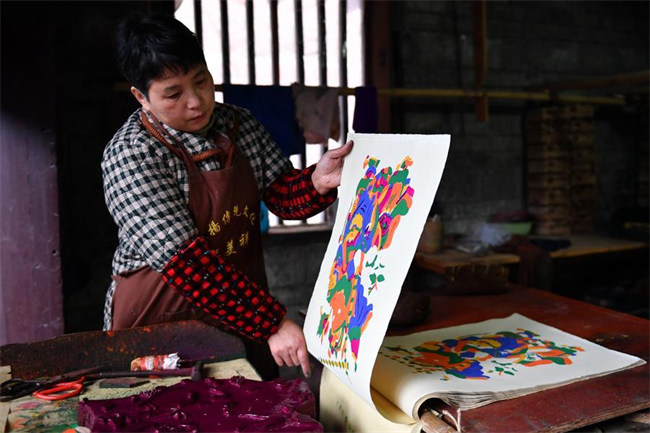 Artist Yin Dongxiang makes copies of nianhua, a type of centuries-old Chinese woodcut New Year picture, at a workshop in Tantou Township of Longhui County, Shaoyang, central China's Hunan Province, Dec. 24, 2025. (Xinhua/Chen Zhenhai)