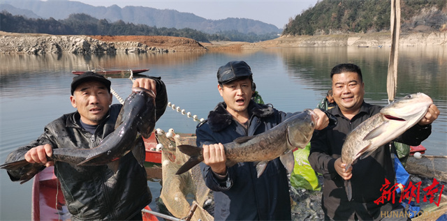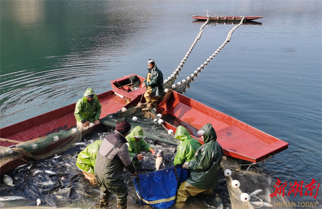 On January 6, the winter fishing season commenced at Yanwutan Reservoir in Yuanling County, with 50,000 kilograms of eco-friendly silver carp harvested for sales. This event attracted numerous non-local fishery dealers to purchase the sustainably farmed fish. The reservoir boasts 18,000 mu (approximately 1,200 hectares) of large-scale aquaculture area, employing methods such as release-based enhancement with natural rearing, stock enhancement, along with regulated fishing, to ensure fishermen directly benefit from the fishery. Simultaneously, the reservoir area continues to explore innovative approaches to integrating fisheries with tourism, with the aim of enhancing its comprehensive industrial benefits. These efforts help achieve a win-win outcome that combines ecological benefits from "using fish to purify water" and "using fish to revitalize water" with industrial benefits from the integration of fisheries and tourism. (Photo/Liu Chunyi and Liu Jingyuan)