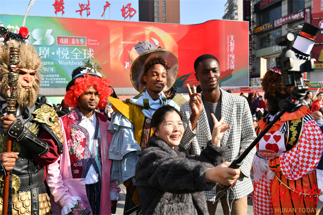 On January 13, a resident posed for a group photo with performers and international students participating in a parade at the central plaza of Huangxing Road Pedestrian Street in Tianxin District, Changsha. That day marked the opening of the "Tianxin Drama -Worldwide Joy" Drama Carnival. Using drama as its theme, the event comprehensively promotes the unique features and high-quality performances of Tianxin's small theaters. It aims to establish Hunan's first small theater cluster, creating a new cultural landmark that integrates performances, interactions, and photo taking, while continuously enhancing the appeal of the "Joy" culture. (Photo/Tian Chao, Hunan Daily)