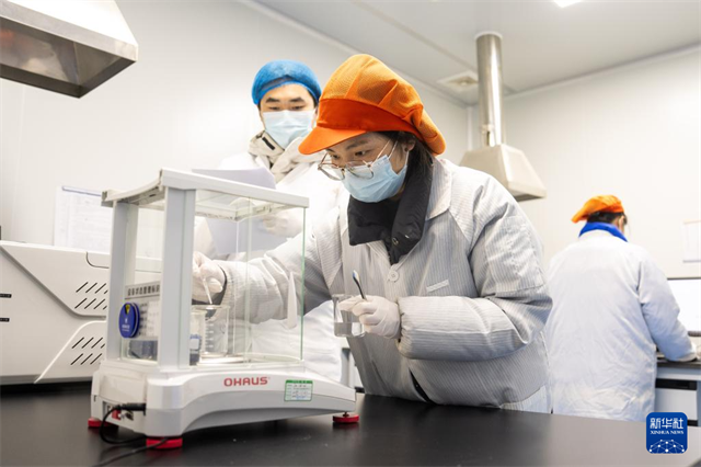 The photo, taken on January 14, shows technicians examining the protein content of medical gel raw materials at a biotechnology company in the Changde High-Tech Industrial Development Zone. (Photo/Chen Sihan, Xinhua)