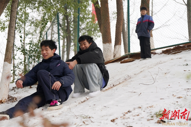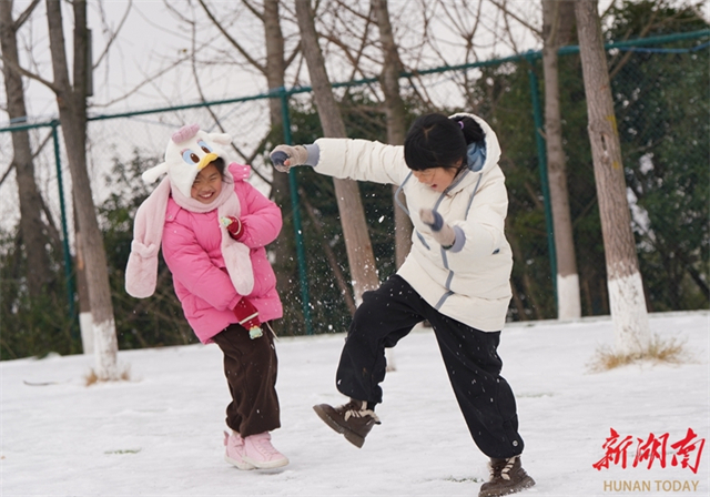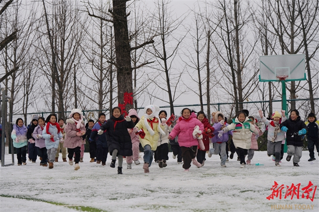 On January 21, students at Zengguofan School in Shuangfeng County stepped out of their classrooms during the inter-class breaks, to enjoy playing in the snow. (Photo/Zhang Changhui)