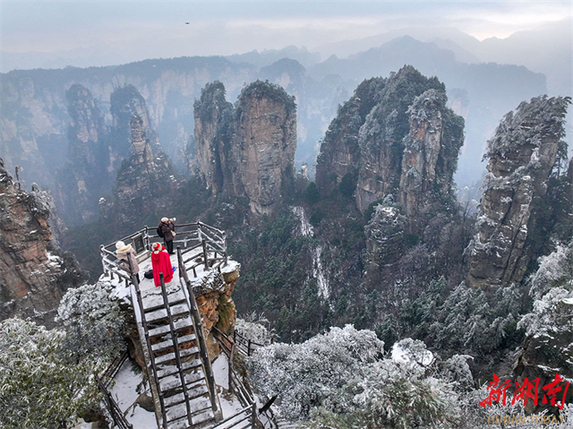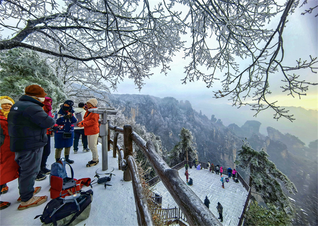 On January 22, photographers captured scenes at Huangshizhai in Zhangjiajie National Forest Park. In recent days, the park has been blanketed in snow, creating a picturesque landscape. The photography tour group consisted of over 200 people from Guangdong, Hebei, and Fujian provinces. (Photo/Guo Liliang, Hunan Daily)