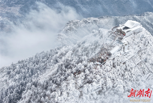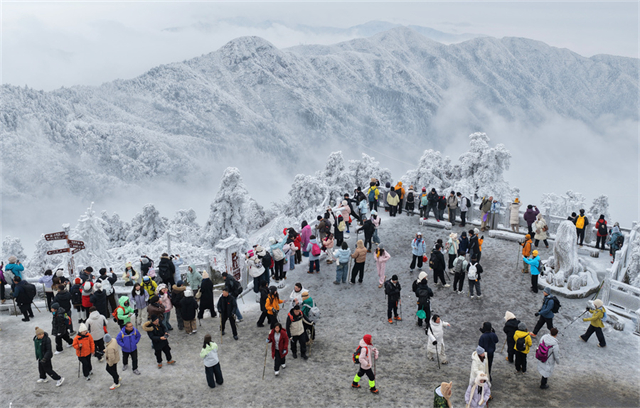On January 22, tourists enjoyed snowy scenery at Hengshan Mountain Scenic Area in Hengyang City. In recent days, the area has been graced with stunning rime ice scenery, drawing crowds of visitors eager to capture the beauty. (Photo/Cao Zhengping and Peng Jinrong)