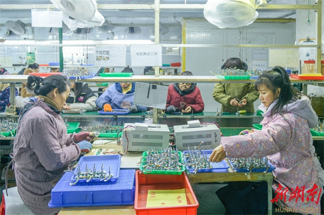 The photo shows workers assembling small motors on the production line at a company in Daoxian County. In recent years, the county authority has vigorously developed its small electric motor manufacturing industry, establishing stable partnerships with domestic and international manufacturers to achieve robust production and sales. (Photo/Jiang Keqing)