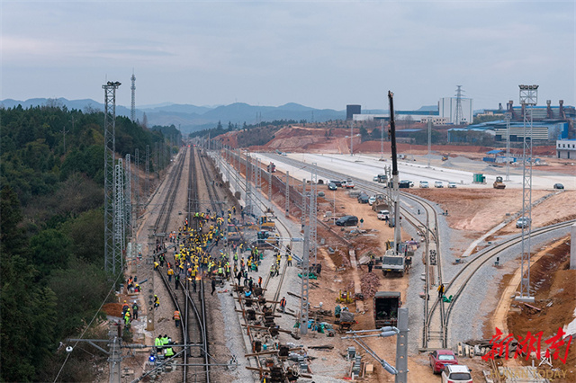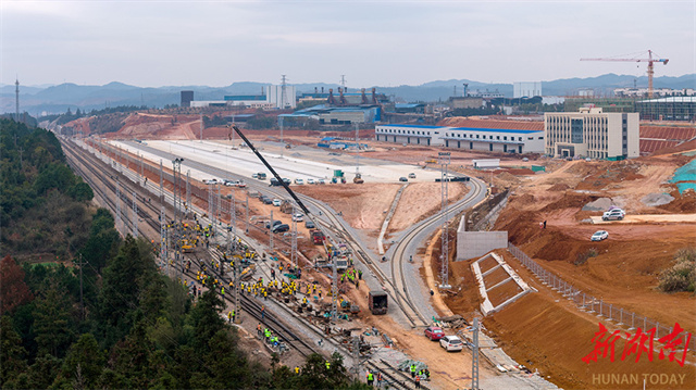 A project to connect the Huaihua International Land Port-Huitong Port Dedicated Railway Line with Lianshan Station along the Jiaozuo-Liuzhou Railway officially commenced on January 24. Coordinated by the China Railway Guangzhou Group Co., Ltd. and constructed by the China Railway 25th Bureau Group Co., Ltd., the project is scheduled to be completed on January 31. Upon completion, the project will add one arrival-departure track, one siding track, and a dedicated freight yard. All this will significantly enhance the cargo handling efficiency of containers and packaged goods, enabling seamless connectivity between Lianshan Industrial Park and the national railway network. (Photo/Zhang Lei)