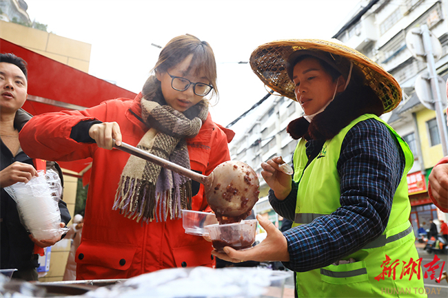 On January 26, volunteers serve Laba porridge to residents at Shunfeng Square, Linwu County. (Photo/Chen Weiping)