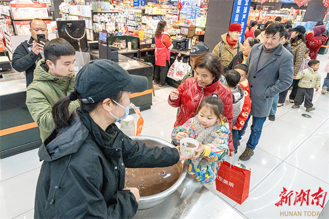 People queue for free Laba porridge at a supermarket in Qianzhou Neighborhood, Jishou City on January 26. As a popular nursery rhyme goes, "When Laba is here, Spring Festival is not far away." Many supermarkets and malls launched porridge servings and sales promotion activities, carrying forward the traditional customs and driving sales of New Year goods. (Photo/Liang Yonghong)