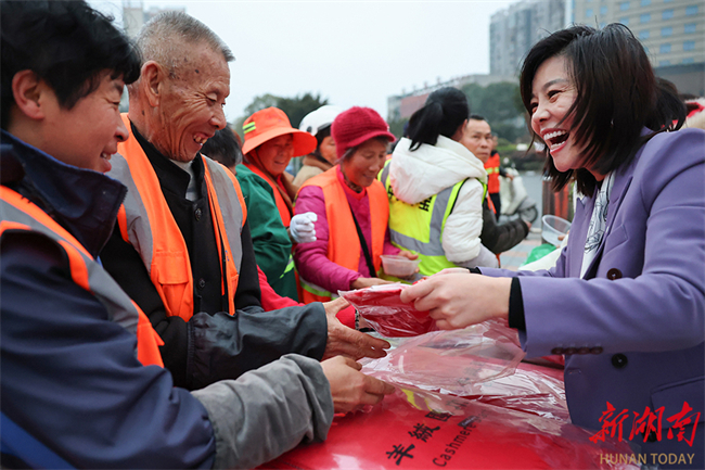 On January 26, community working staff serve Laba porridge to sanitation workers, elderly residents, and other groups at Xinjiefang Community, Chengzhong Neighborhood, Hecheng District, Huaihua. This activity aims to let residents feel the care and warmth of their neighborhood during this traditional festival. (Photo/Chai Junlin and Liu Jiahui)