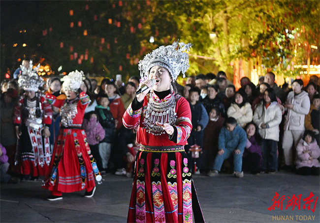 On the evening of February 11, an artist performed Miao folk songs. Chengbu Miao Autonomous County launched its Spring Festival celebrations at Nanhu Park on the same day. Featuring seven major themes including intangible cultural heritage, lantern displays, and parades, the events will offer residents a 20-day cultural feast. (Photo/Yan Qinlong)
