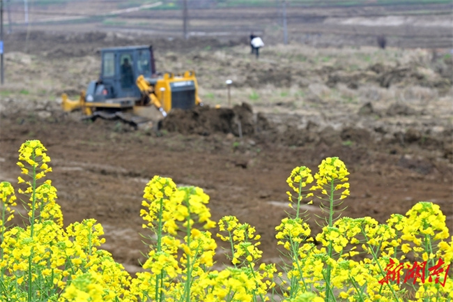 The photo, taken on February 23, shows a bulldozer leveling fields at a high-standard farmland construction project site in Tanshan Village, Jinkai Neighborhood, Shuangfeng County. On the same day, multiple high-standard farmland construction projects resumed construction across the county. Construction workers raced against the farming season to accelerate progress, creating a bustling scene in the fields. (Photo/Li Jianxin and Wang Lejun)