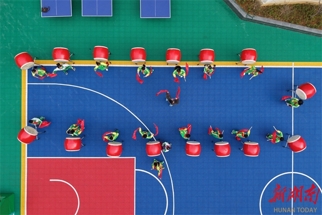 On March 4, students stage a Miao drum performance at the Shazi'ao Primary School in Xiangxi Tujia and Miao Autonomous Prefecture. A new semester kicked off for primary and secondary schools as well as kindergartens across Hunan Province on that day. Students returned to their schools in order, embracing the new semester. (Photo/Peng Biao)