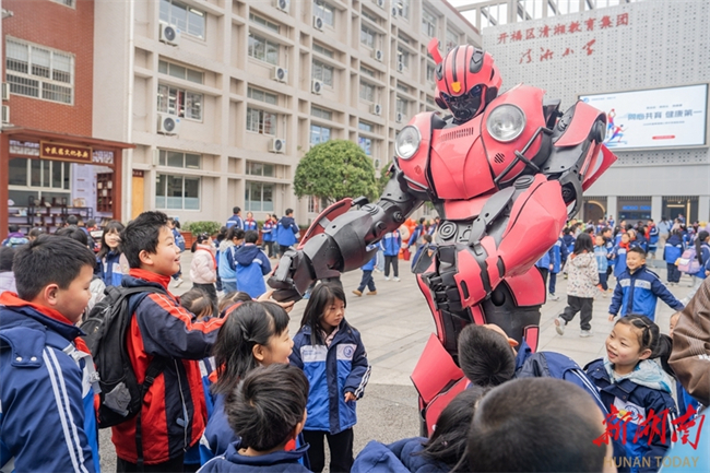 On March 4, students interact with a robot at the Qingxiang Primary School in Kaifu District, Changsha. A new semester kicked off for primary and secondary schools across Hunan Province on that day. Students embraced the new semester with various activities, such as decorating the campus, receiving new textbooks, and having the "first lesson". (Photo/Li Jian)