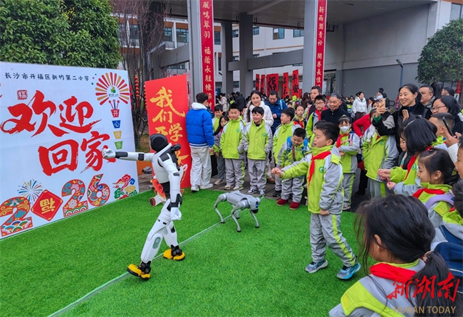 On March 4, students interact with an intelligent robot and a robot dog at the Xinzhu Second Primary School in Kaifu District, Changsha, greeting the spring semester with such "AI technology + education" mode vibrantly. (Photo/Guo Liliang)