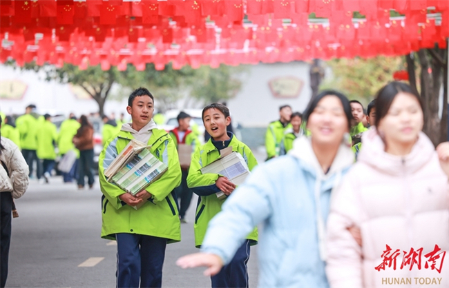On March 4, students carry new textbooks happily at the Minzu Middle School in Mayang Miao Autonomous County. A new semester kicked off for primary and secondary schools as well as kindergartens across Hunan Province on that day. Students returned to their schools in order, embracing the new semester. (Photo/Teng Shuming)