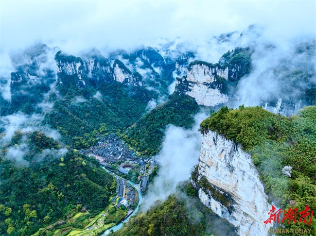 On March 18, the Aizhai Wonder Scenic Area is shrouded in clouds and mist after a rainfall. The Dehang Canyon and Miao villages loom in and out of view amid mist, resembling an exquisite "Chinese ink wash painting." (Photo/Peng Jing)
