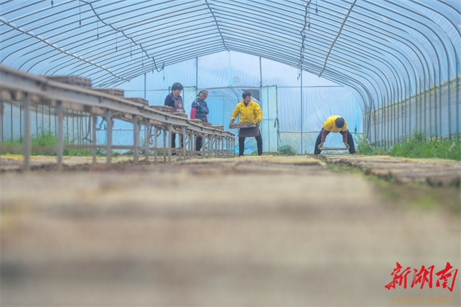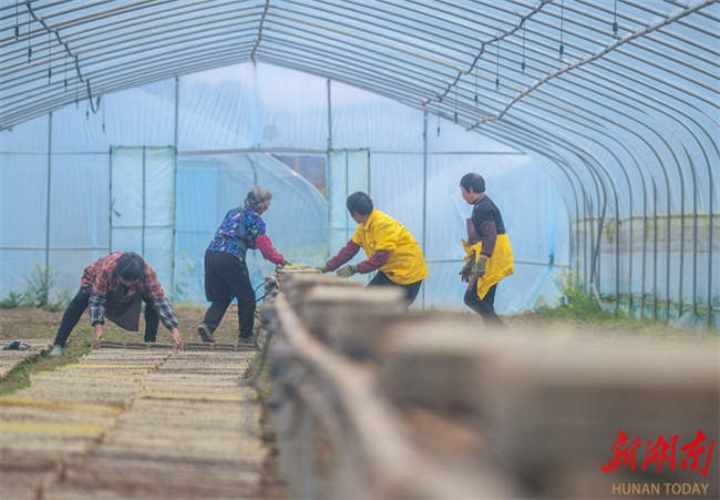 The photo, taken on March 19, shows farmers arranging seedling trays at Baishizhai Village, Shouyan Town, Daoxian County. Spring Equinox, or Chunfen, the fourth solar term in the Chinese lunar calendar, begins on March 20 this year. During this period, farmers across the province are seizing the favorable farming season to engage in agricultural activities, presenting a vibrant picture of farming scene. (Photo/Jiang Keqing)