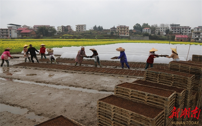 The photo, taken on March 19, shows villagers raising early-season rice seedlings at Mutangyuan Town, Taoyuan County. Spring Equinox, or Chunfen, the fourth solar term in the Chinese lunar calendar, begins on March 20 this year. During this period, farmers across the province are seizing the favorable farming season to engage in agricultural activities, presenting a vibrant picture of farming scene. (Photo/Tong Xianfeng)