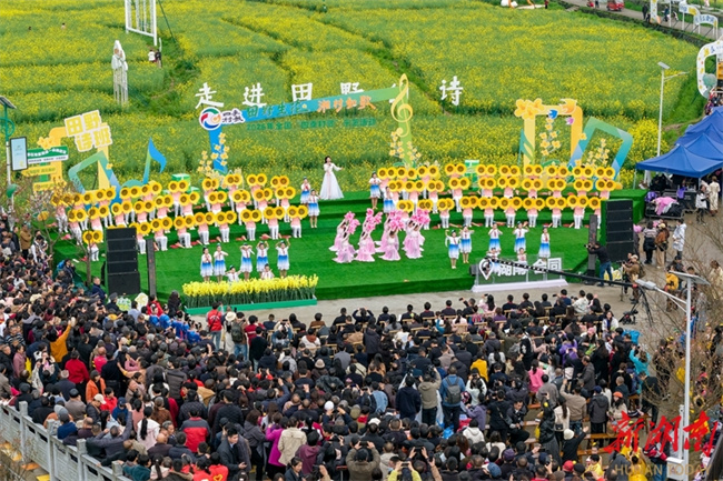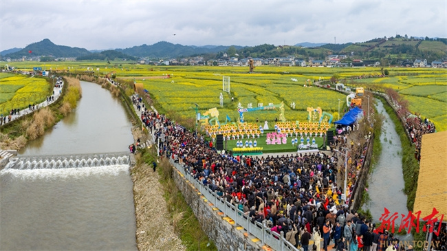 On March 28, the 2026 National Four Seasons Village Gala Demonstration Event kicked off at the Daoxiang Shitian Scenic Area in Baozi Town, Huitong County. Set against the natural backdrop of a vast sea of canola flowers, this immersive cultural event used village songs as the theme, blending agricultural customs, ethnic traditions, and melodies. It vividly showcased the poetic charm and vitality of rural areas in the new era, marking the spring prelude to the national "Four Season Village Gala" initiative. (Photo/Zhang Lei)
