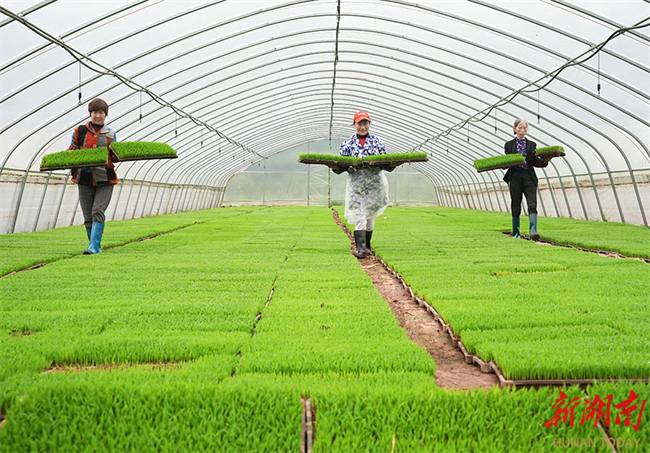 The photo, taken on March 30, shows villagers taking care of early-season rice seedlings in a greenhouse at a planting and breeding cooperative in Qidong County. As temperatures gradually rise, farmers across the province are seizing the farming season to engage in spring farming, presenting a vibrant scene in the fields. (Photo/Cao Zhengping and Chen Xi)