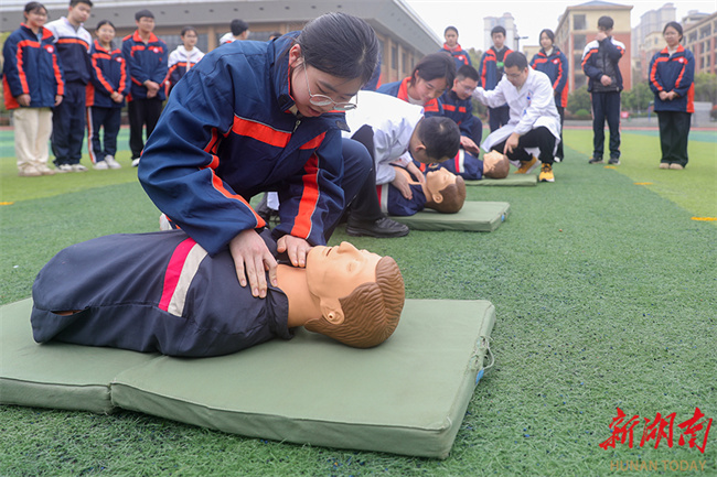 On March 30, medical staff guided students through CPR and other first aid drills. That day marked China's national safety education day for middle and primary school students. The Hengyang County Experimental School worked with the Hengyang County Maternal and Child Health Hospital to host a themed event. Medical staff taught students CPR, bandaging, and other first aid skills, and explained how to use fire extinguishers, thereby enhancing the students' safety awareness and emergency response capabilities. (Photo/Liu Xinrong)