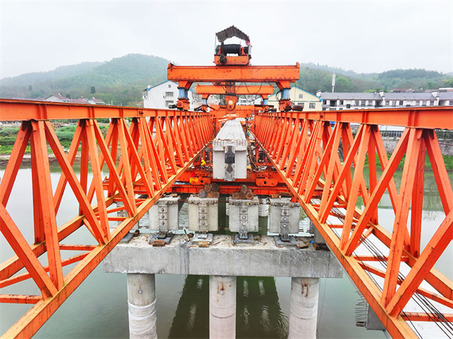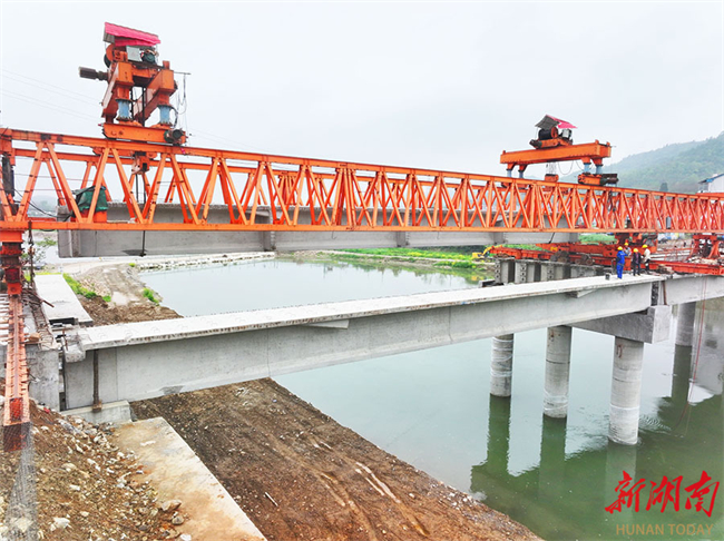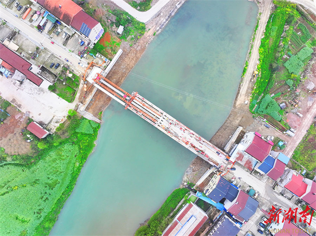 On April 9, the last T-beam was hoisted into place onto the reconstructed Bianshan River Bridge in Lisong Village, Huolianpo Town, Lixian County, marking that the bridge reconstruction project has entered the final sprint phase of deck construction. This bridge, a part of the S233 highway, connects Hunan and Hubei provinces. Originally completed and opened to traffic in 1967, the bridge began to be reconstructed in last October and is scheduled to reopen to traffic within this year. Upon reopening, it is expected to facilitate regional economic and social development at a higher standard. (Photo/Bai Yipu)