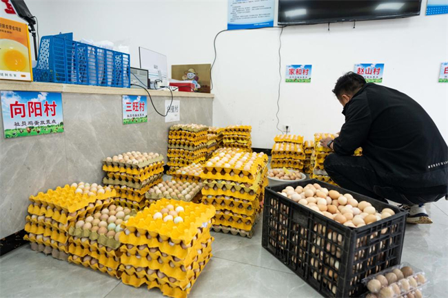 A staff member sorts the freshly collected eggs by their place of origin at the Qianjiadan Breeding Cooperative in Guyuefeng Town on April 15. (Photo/Chen Sihan, Xinhua)