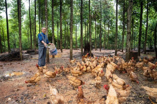 A staff member of a chicken breeding cooperative feed chickens in Yuefeng Village, Guyuefeng Town on April 15. (Photo/Chen Sihan, Xinhua)