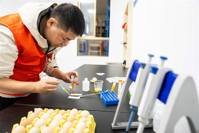 A staff member conducts quality check for eggs at the Qianjiadan Breeding Cooperative in Guyuefeng Town on April 15. (Photo/Chen Sihan, Xinhua)