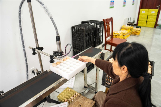 A staff member packages eggs at the Qianjiadan Breeding Cooperative in Guyuefeng Town on April 15. (Photo/Chen Sihan, Xinhua)