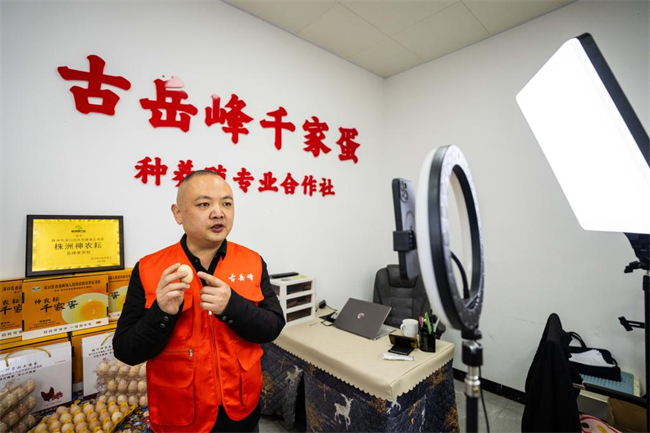 A staff member promotes eggs via livestreaming at the Qianjiadan Breeding Cooperative in Guyuefeng Town on April 15. (Photo/Chen Sihan, Xinhua)