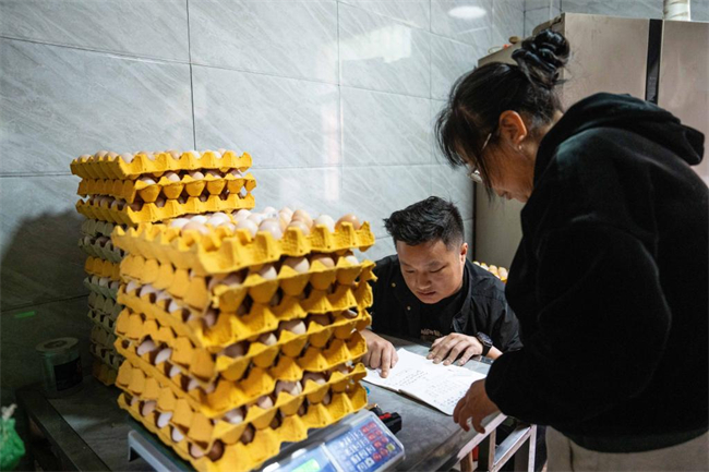 A staff member (L) of the chicken breeding cooperative purchases free-range eggs at a farmhouse in Zhaoshan Village, Guyuefeng Town on April 15. (Photo/Chen Sihan, Xinhua)