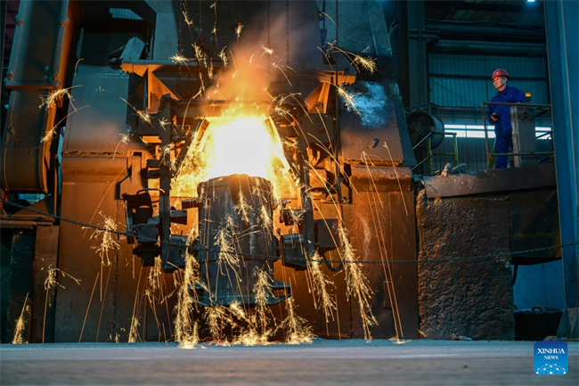 A worker controls equipment to pour molten iron in a machinery manufacturing company in Jinhu County, Huai'an City, east China's Jiangsu Province, Feb. 24, 2026. Factories and companies across China resumed work after the Spring Festival holiday on Tuesday. (Photo by Liang Debin/Xinhua)