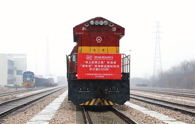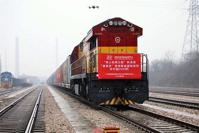 On February 11, a Hunan-Guangdong-Africa rail-sea intermodal international freight train, fully loaded with auto parts, departed along the dedicated railway line of a Hunan-based port economic and trade development company. It is heading for Guangzhou's Nansha Port before being transferred to sea transport. This marked the 2,000th train trip since the launch of the Hunan-Guangdong-Africa rail-sea intermodal international freight train service in 2021. (Photo/Meng Xianglin)